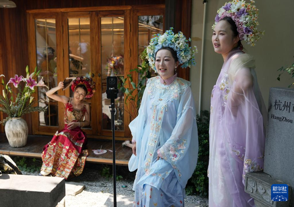 6月16日,人们在杭州小河直街历史文化街区体验拍摄“簪花照”。