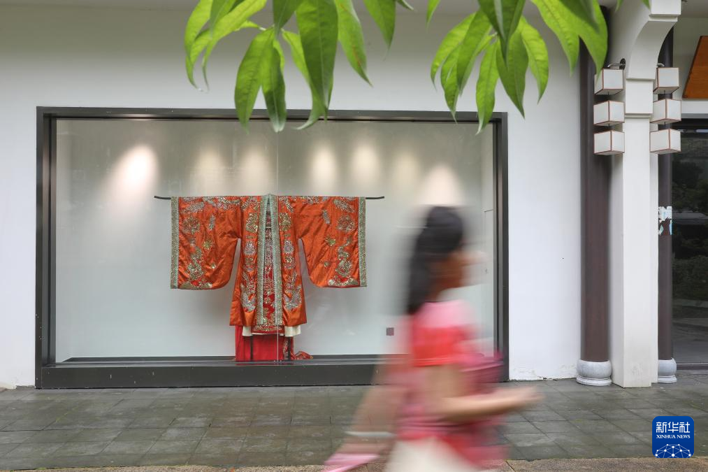 6月29日,游客从芦席汇历史街区一家汉服体验馆前走过。
