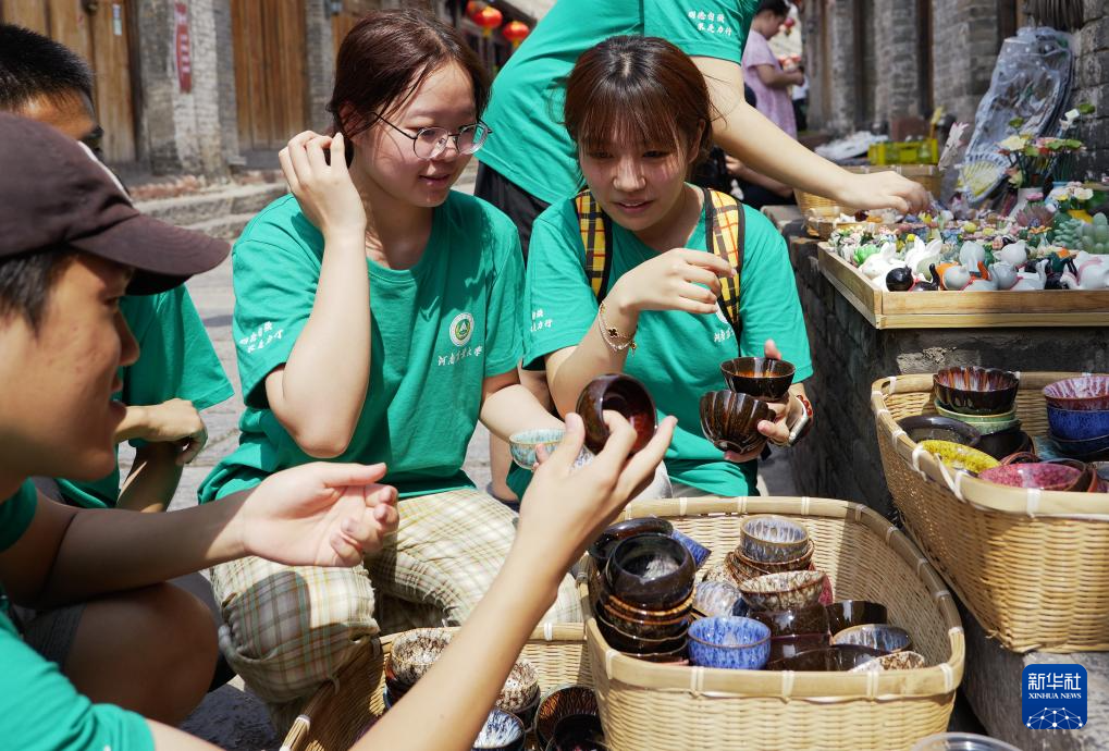 在河南省禹州市神垕镇,河南农业大学的学生在挑选钧瓷产品(7月3日摄)。