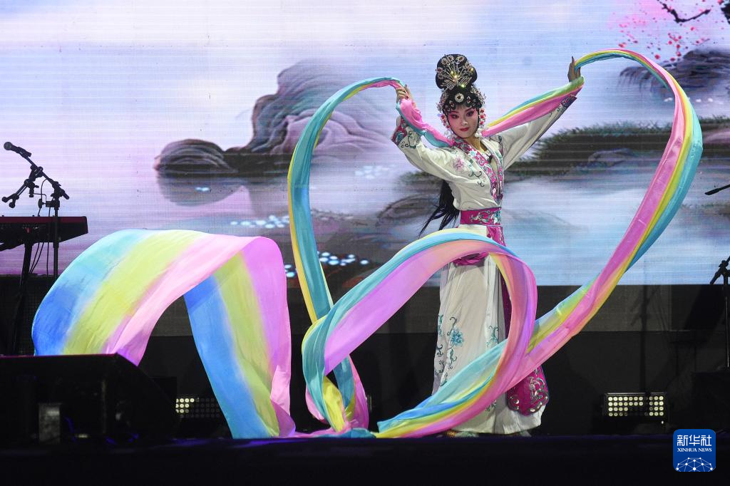 8月17日,在巴西首都巴西利亚,来自浙江婺剧艺术研究院的演员在沙滩艺术节中国日活动上表演。