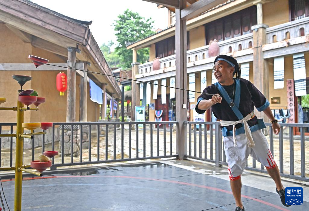 何光斌在南丹县里湖瑶族乡朵努社区展示空中放陀螺(8月30日摄)。