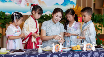 9月8日,在江苏省兴化市文林幼儿园,小朋友在老师的指导下学习做月饼。
