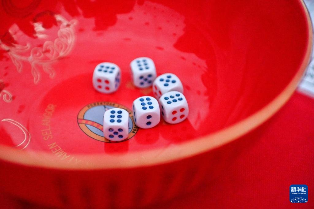 这是9月17日在马来西亚雪兰莪州巴生拍摄的民众在博饼活动中掷出的骰子。