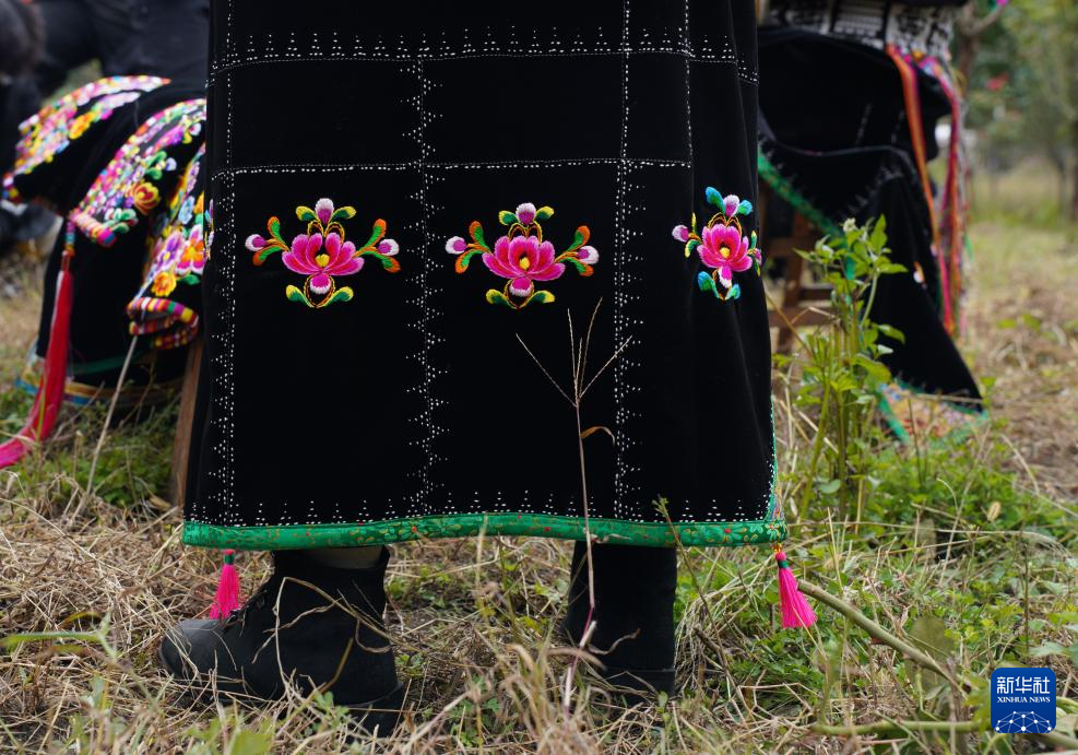 这是10月12日在四川省甘孜藏族自治州丹巴县巴底镇色足村拍摄的嘉绒藏族刺绣后围裙局部。