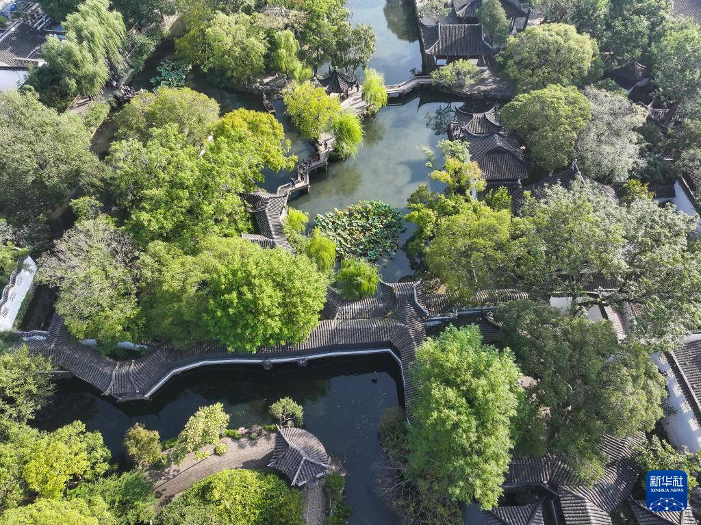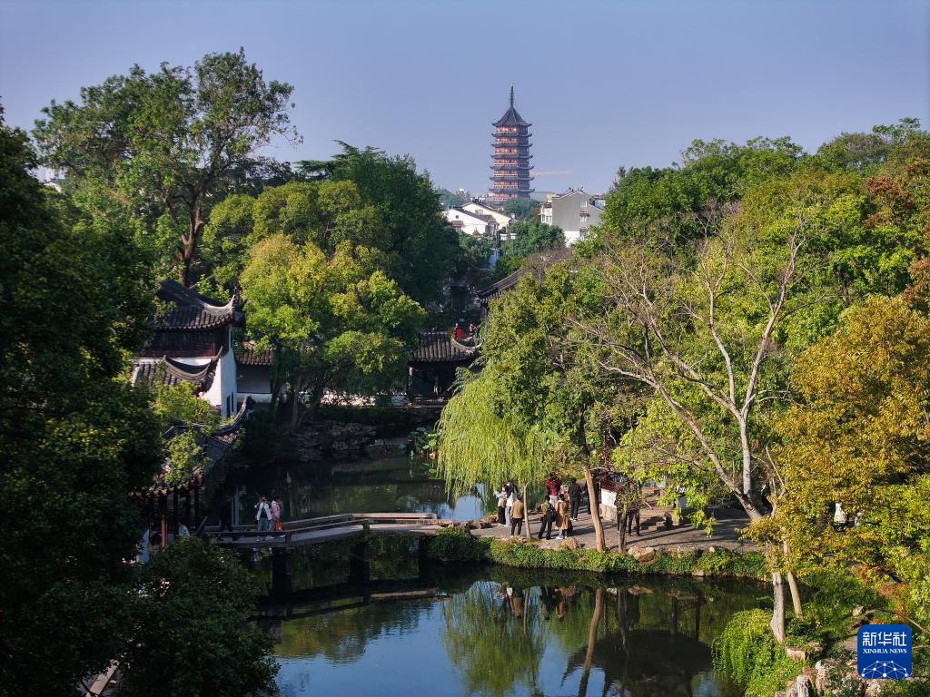 苏州园林西溪环翠游览景色(10月23日摄,无人机照片)。西溪环翠位于虎丘西南麓。