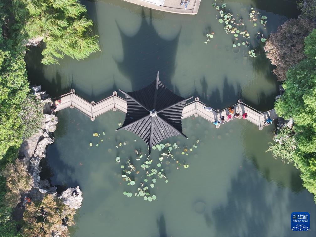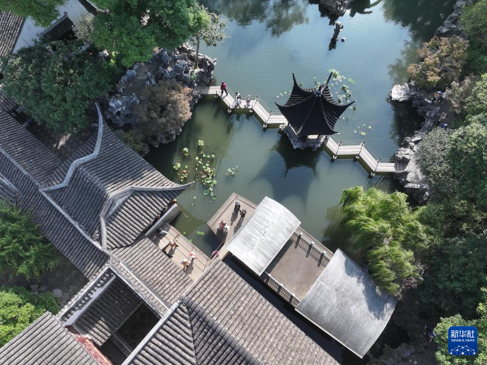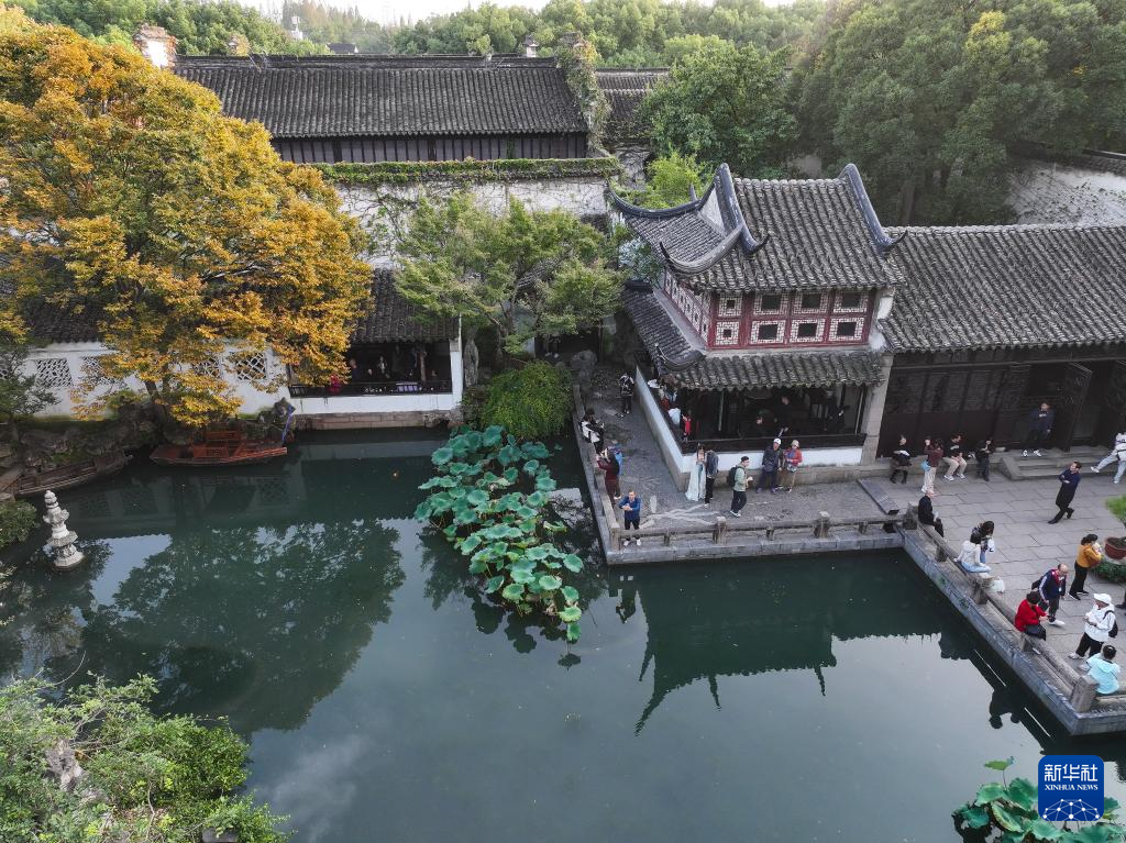 游人在苏州园林西溪环翠游览(10月23日摄,无人机照片)。