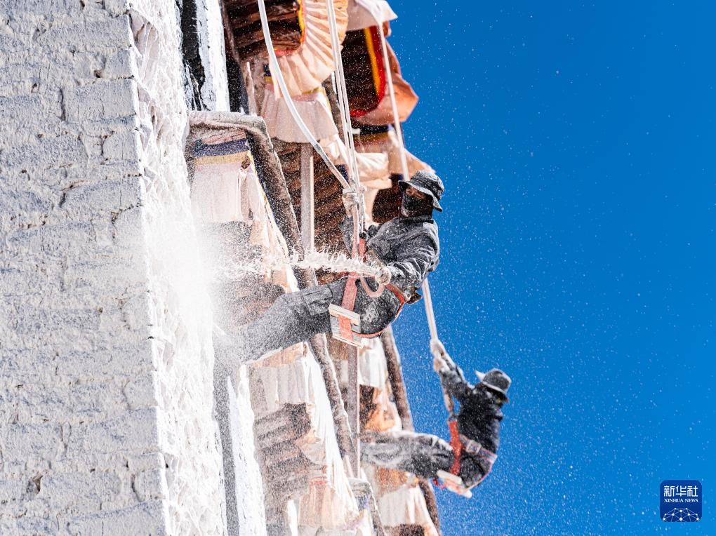 10月30日,布达拉宫管理处的工作人员在喷洒涂料。