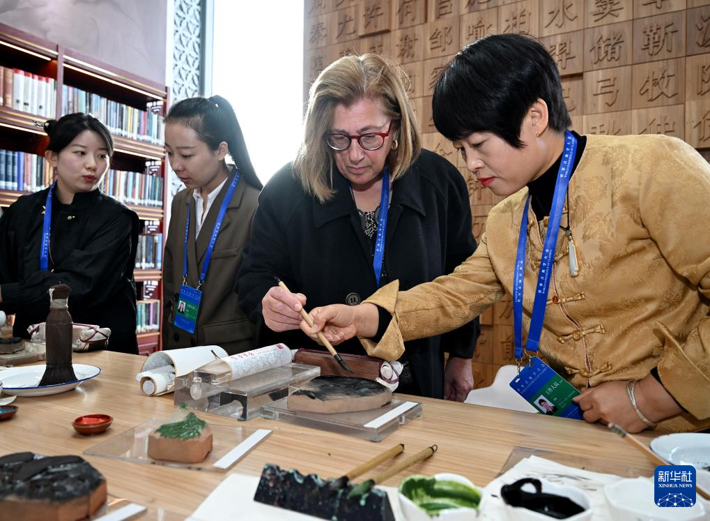 11月7日,一名外国观众(右二)在展台前体验“荣宝斋木版水印技艺”非遗项目。