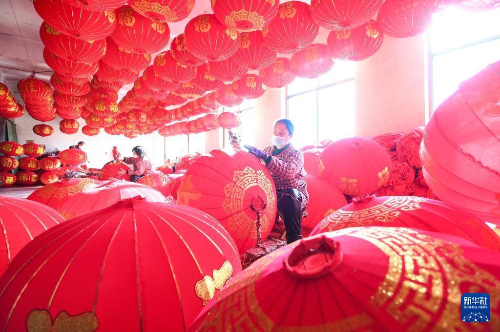 12月16日,在河北省石家庄市藁城区屯头村一家宫灯厂,村民们在制作宫灯。