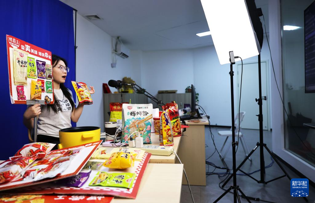 柳州市螺蛳粉产业园一家螺蛳粉生产企业工作人员通过直播在线销售螺蛳粉(11月13日摄)。