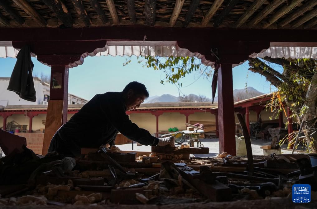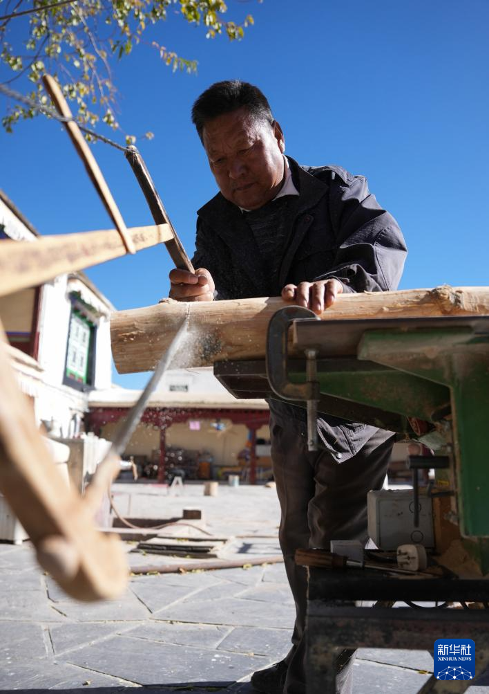 布达拉宫管理处维修科工作人员顿旦次仁在制作修缮所需的木构件(12月4日摄)。