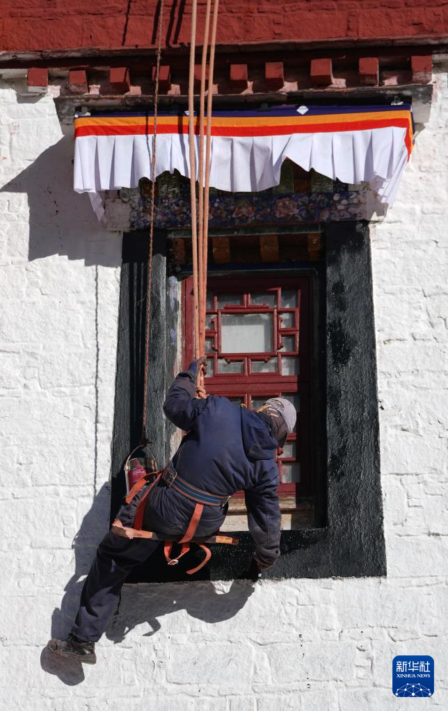 布达拉宫管理处维修科工作人员在粉刷墙体(12月4日摄)。