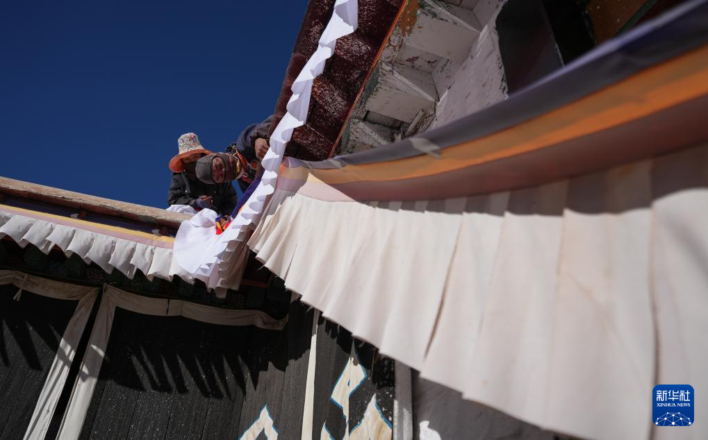 布达拉宫管理处维修科工作人员格桑央金(左)和朗杰在更换香布(12月4日摄)。