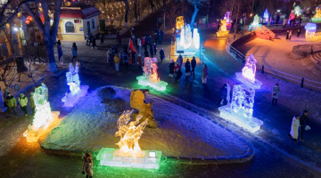 1月7日,在哈尔滨市兆麟公园,冰雕师们在雕琢冰雕作品(无人机照片)。