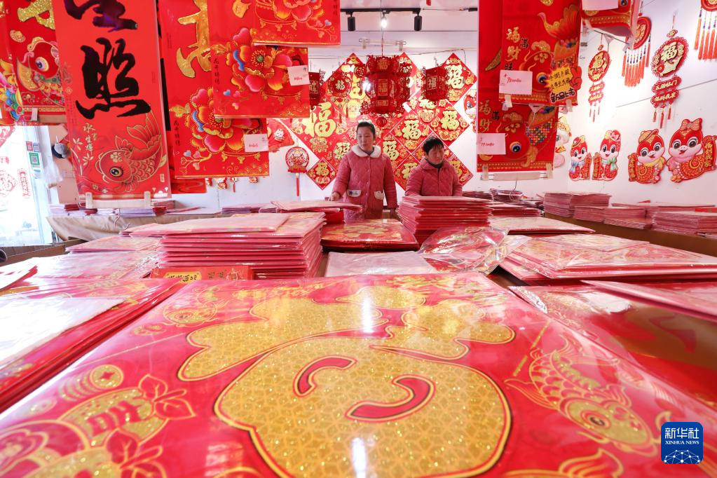 1月13日,顾客在河南省焦作市温县赵堡镇年画市场选购新年饰品。