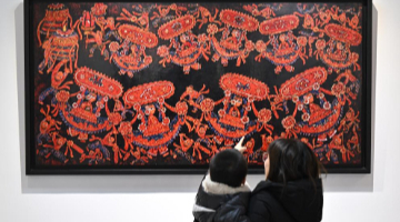 1月13日,参观者在新落成的长安书院内观看工作人员制作木版年画。