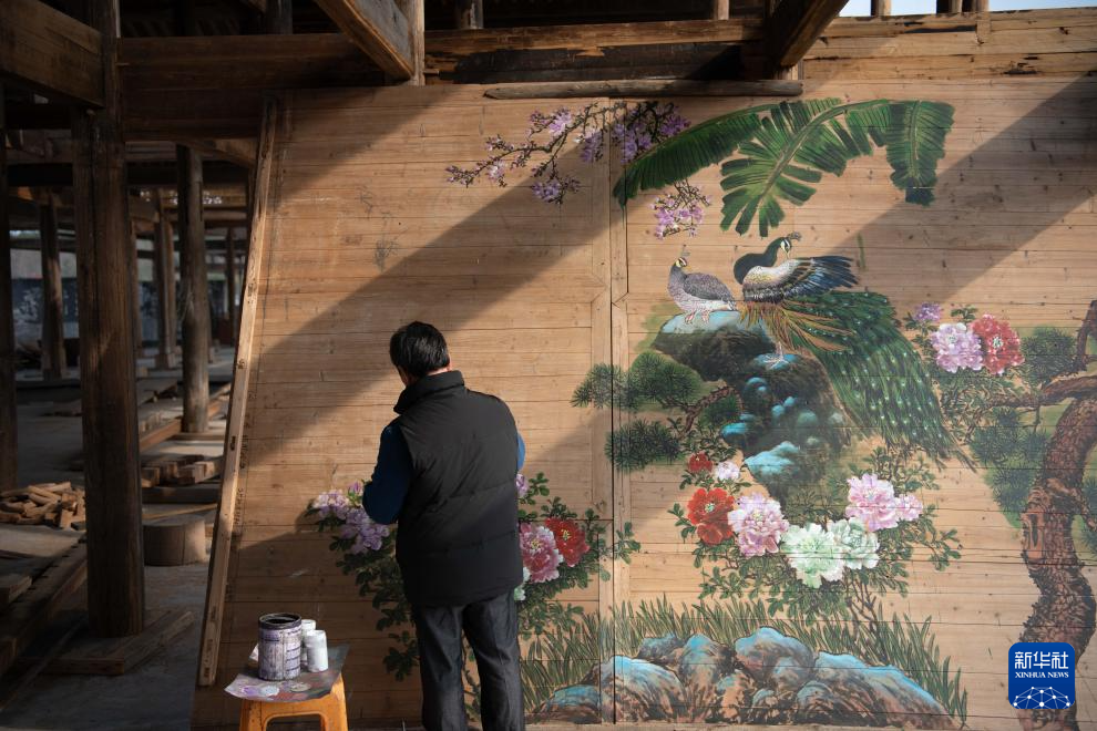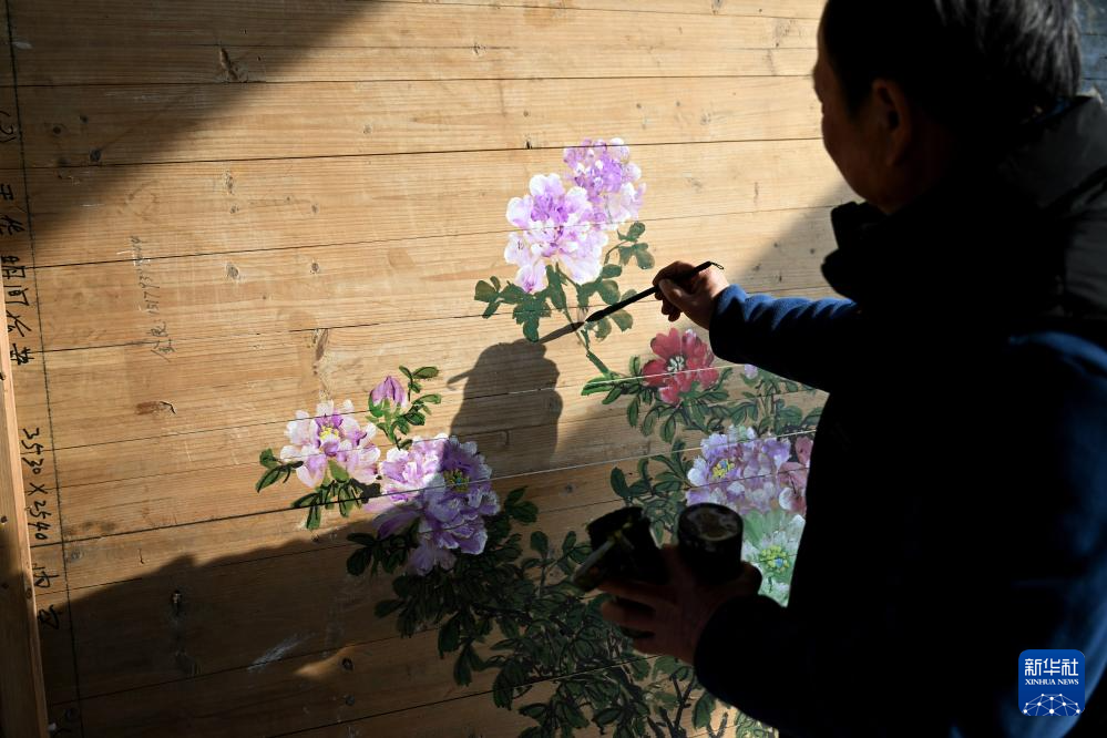 1月6日,在黄山徽匠园林古建有限公司厂区,工匠应中秋在徽派仿古建筑的构件上进行彩绘。