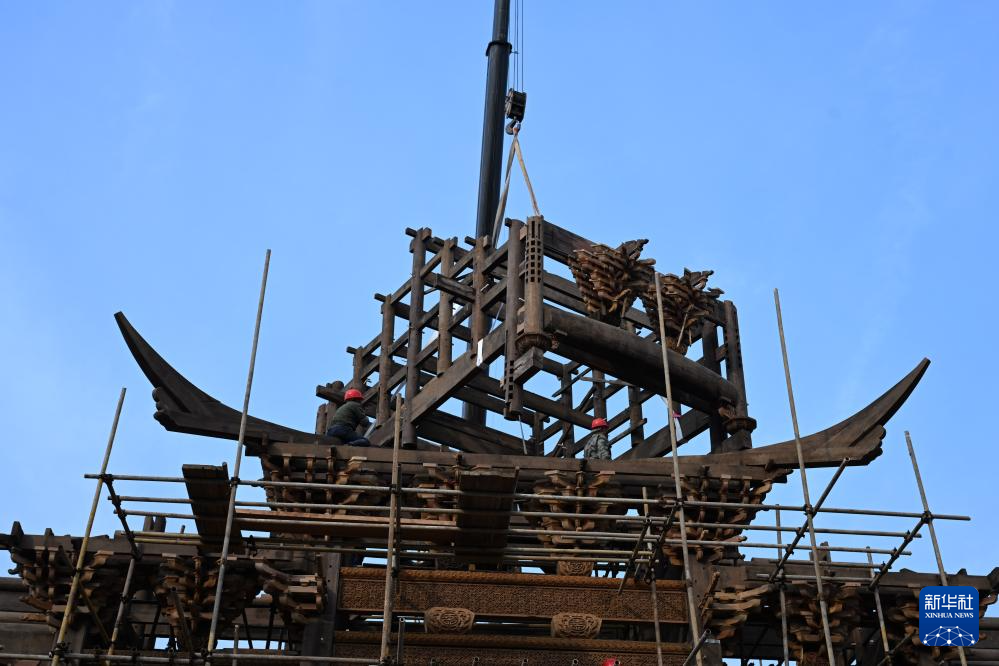 1月8日拍摄的安徽省黄山市休宁县一处传统徽派古民居复建工地现场。