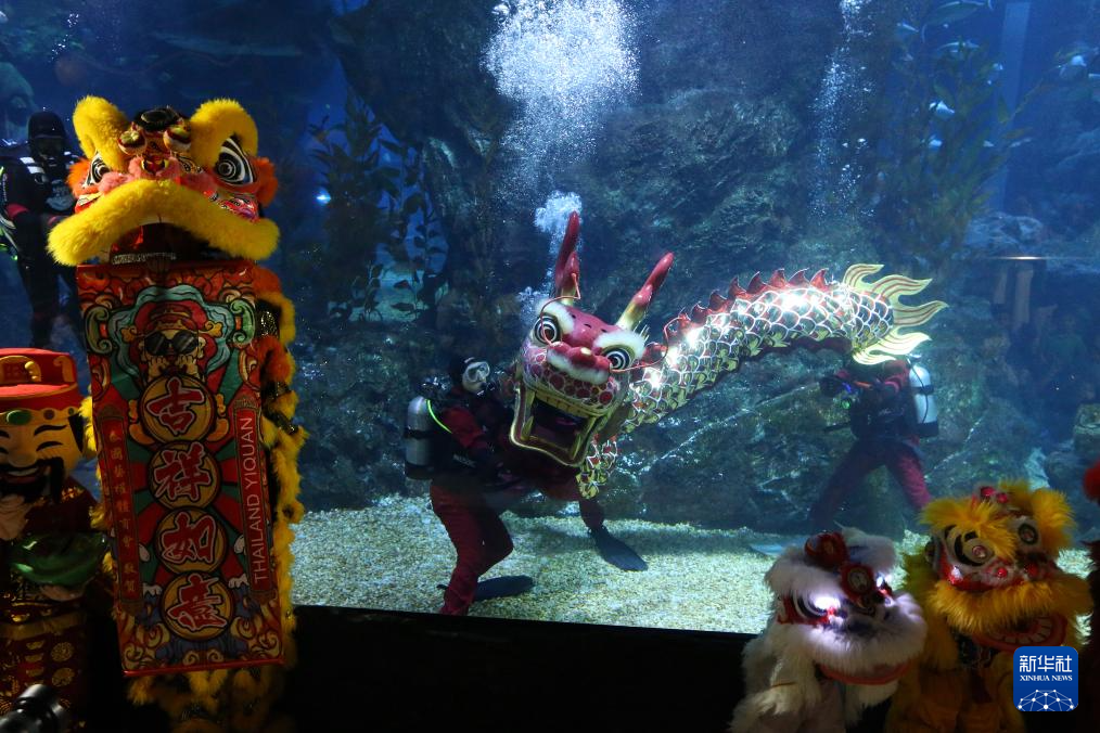 1月16日,在泰国曼谷暹罗海洋世界,潜水员在水下表演舞龙。