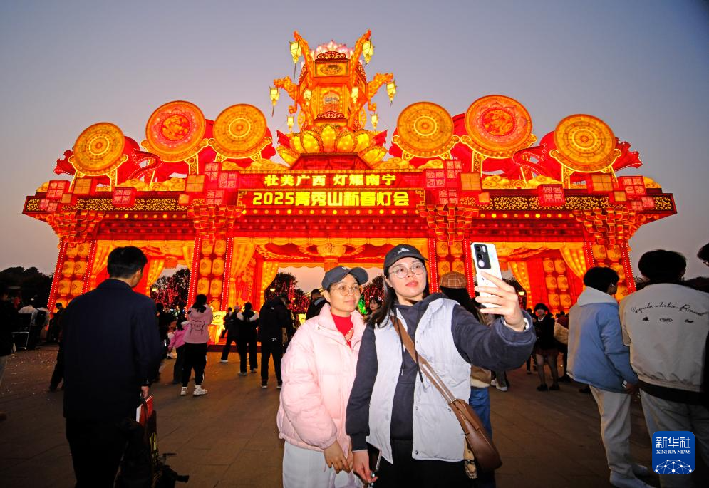 1月18日,游客在广西南宁2025青秀山新春灯会上自拍。