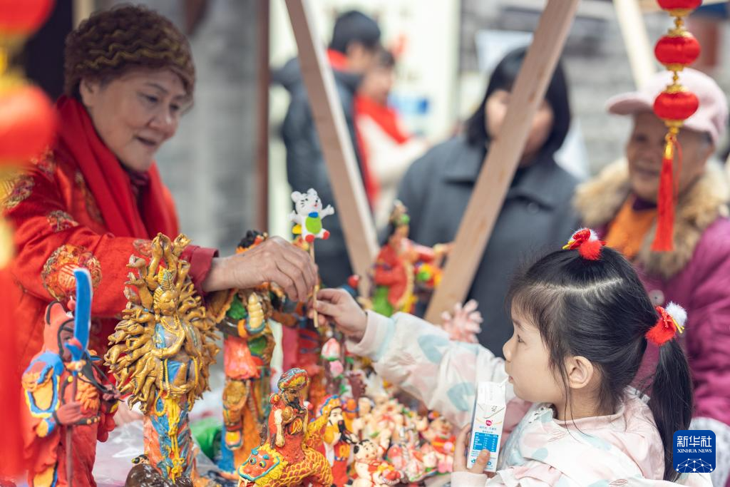 1月21日,在重庆市巴南区西流沱小镇,非遗面塑传承人将面塑作品赠送给小朋友。
