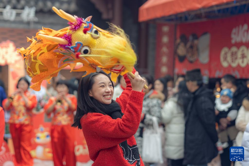 1月21日,游客在重庆市巴南区西流沱小镇体验非遗项目姜家舞龙。