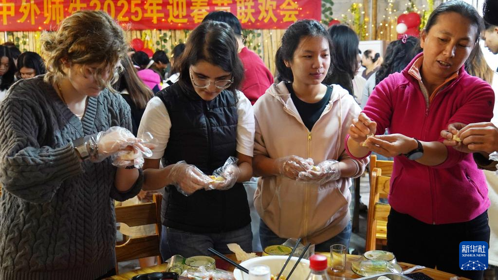 1月23日,在广西桂林市广西师范大学育才校区,外国留学生在中外师生迎新春联欢会上包饺子。