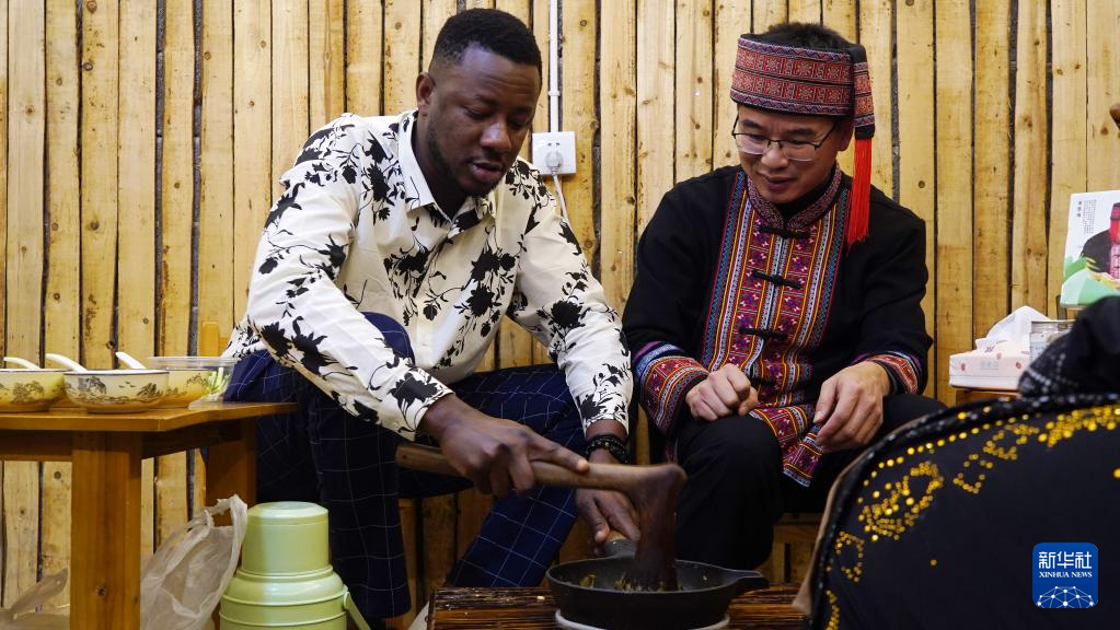 1月23日,在广西桂林市广西师范大学育才校区,几内亚留学生阿布(左)在中外师生迎新春联欢会上体验恭城油茶制作。