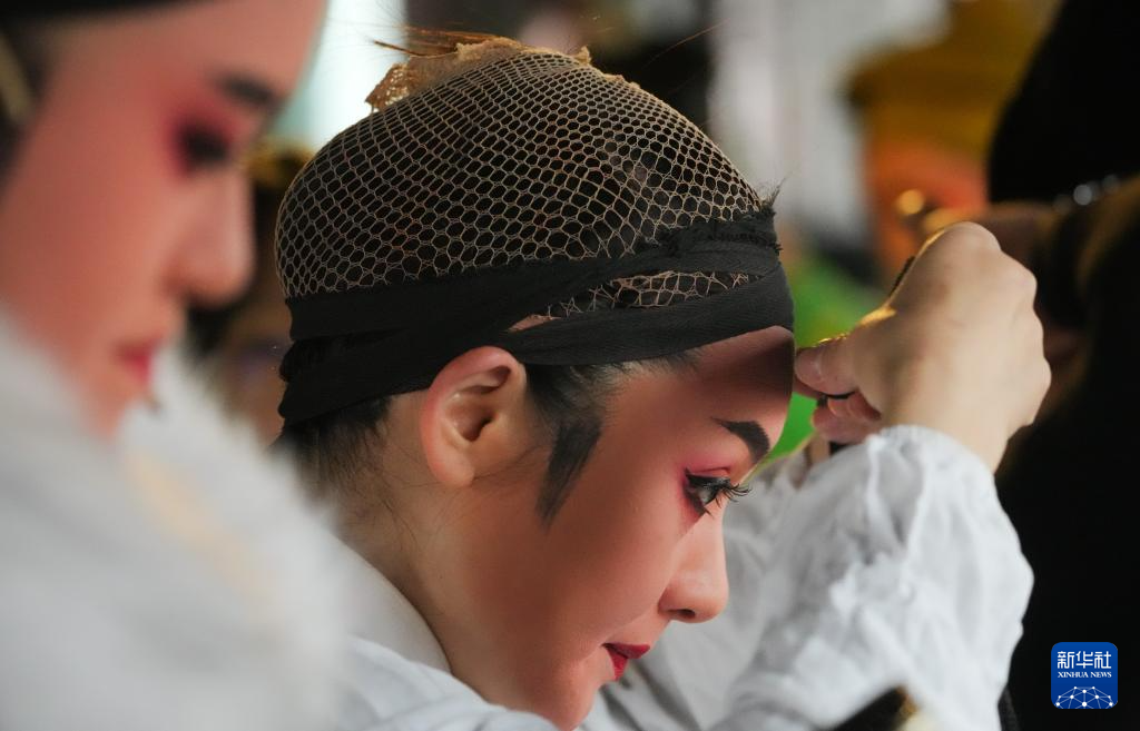 在绍兴市柯桥区夏履镇莲增村,民间越剧团晶蕾艺术团的演员在为表演越剧《五女拜寿》做准备(1月25日摄)。