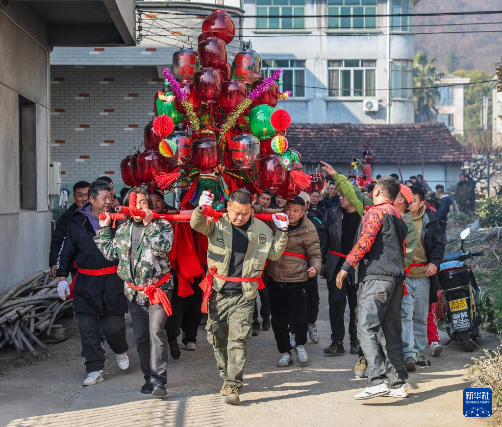 当日是农历正月十三,浙江省金华市金东区赤松镇虎岩村村民肩扛由100余节板凳组成的传统五彩龙灯,沿村道蜿蜒游舞。板凳龙的龙头被彩灯包裹,装饰有花卉、祥云等图案,在烛光摇曳间营造出“龙腾盛世”的年俗画卷。每年元宵节前后,浙江省金华市金东区赤松镇的各村村民都会舞起板凳龙灯,祈求来年风调雨顺、五谷丰登。