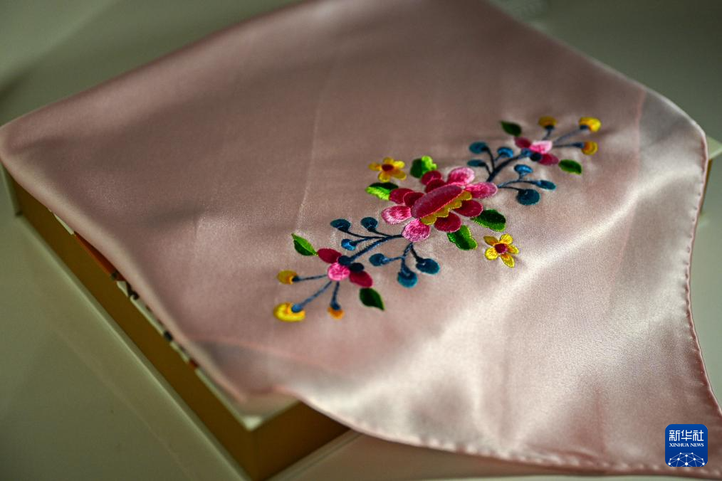 这是3月14日在任炜汉绣工作室拍摄的汉绣制品。