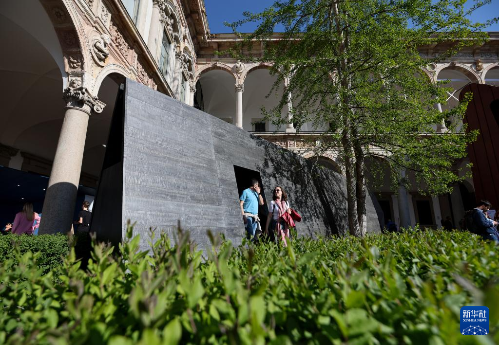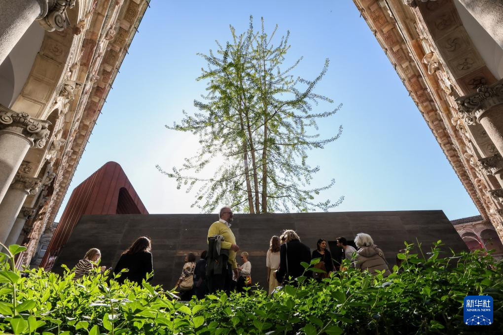 4月11日,在意大利米兰国立大学,人们参观中国设计师吴滨的设计作品《杳然庭》。
