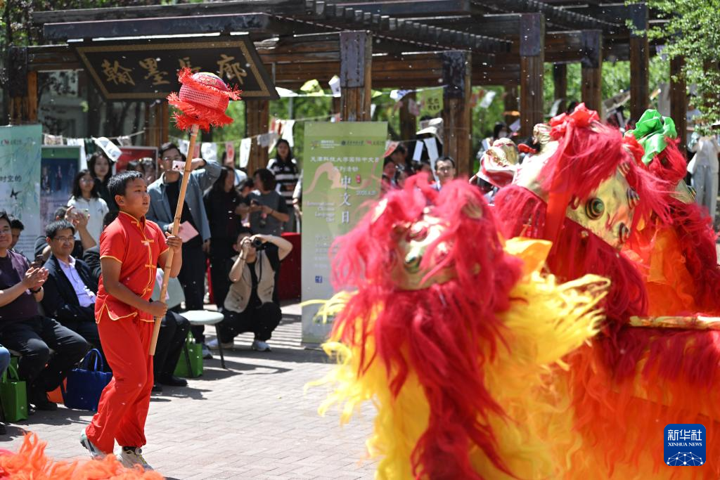 4月17日,在天津科技大学,柳林小学学生在庆祝活动上表演舞狮节目。
