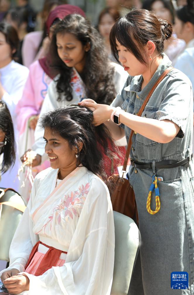 4月17日,天津科技大学的留学生体验传统服饰造型。