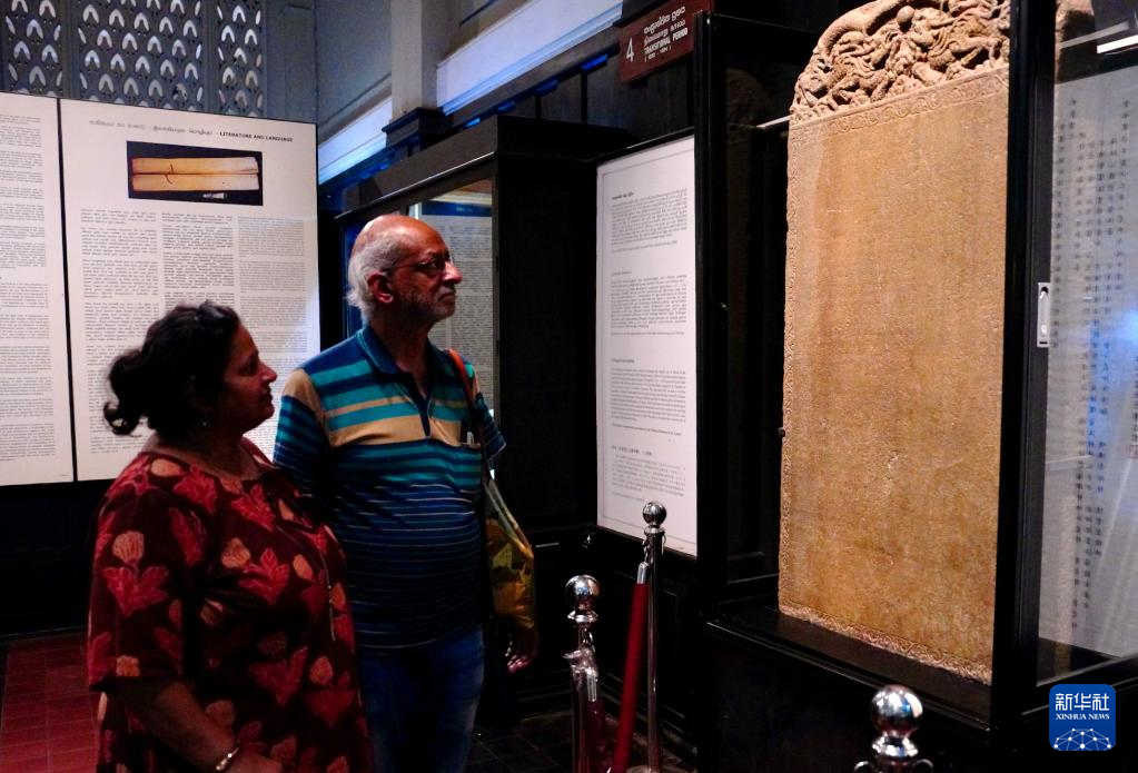 4月17日,郑和遗存《布施锡兰山佛寺碑》(中)在斯里兰卡科伦坡国家博物馆主展厅展出。