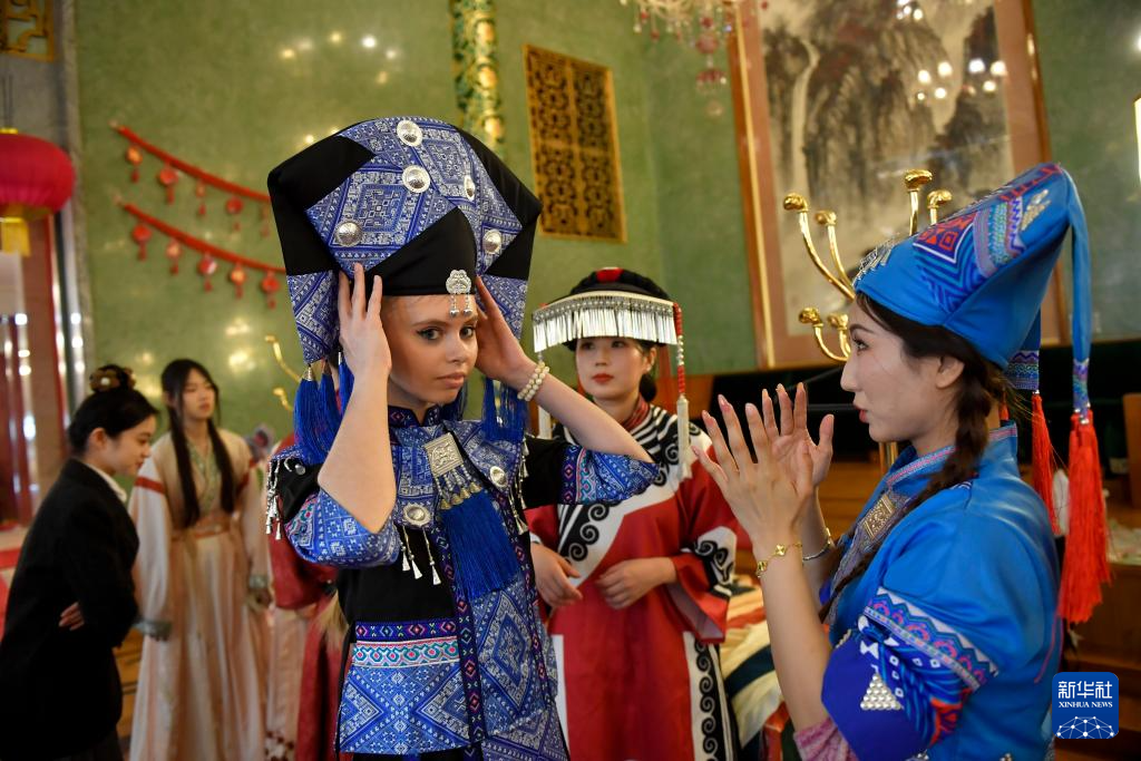 4月20日,学生在俄罗斯首都莫斯科举行的“国际中文日”活动上体验中国民族服饰。