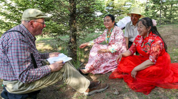 仁增旺扎在观赏皮央石窟壁画(6月24日摄)。