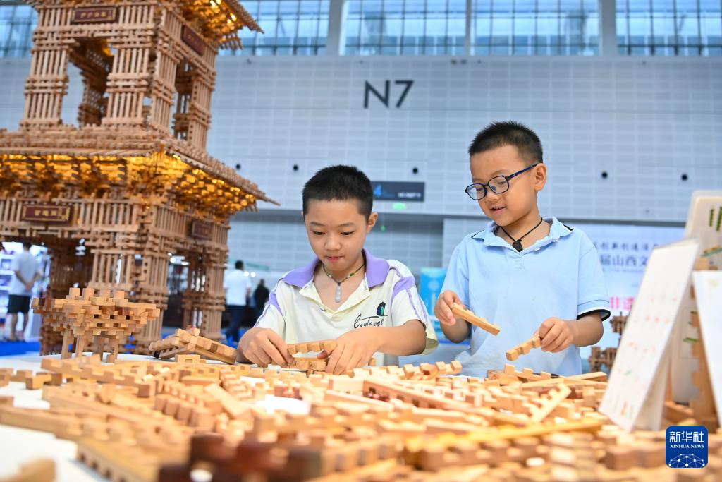 8月21日,两位小朋友在第七届山西文化产业博览交易会上体验榫卯积木拼搭。