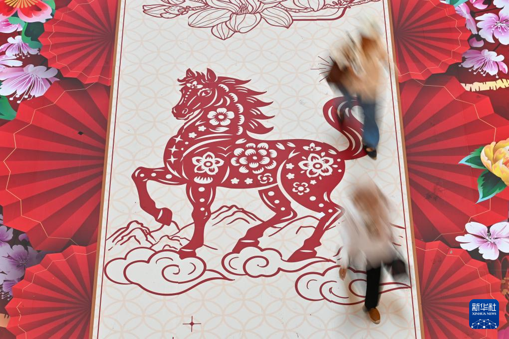 1月30日,在马来西亚吉隆坡,一家商场的地面铺上了马年剪纸主题的地贴。