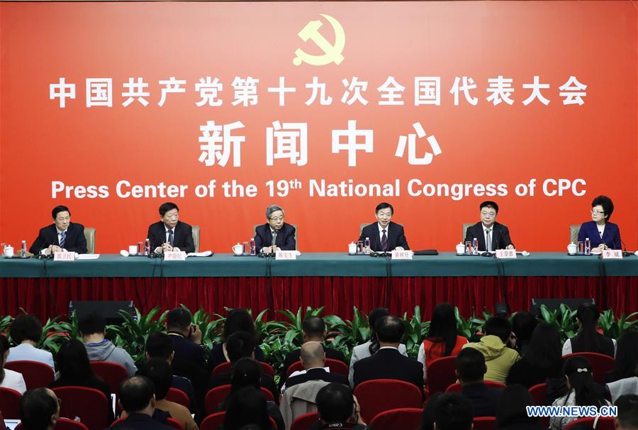 The press center of the 19th National Congress of the Communist Party of China (CPC) holds a press conference on securing and improving people's livelihood, in Beijing, capital of China, Oct. 22, 2017. China's Minister of Education Chen Baosheng (3rd L), Minister of Civil Affairs Huang Shuxian (3rd R), Minister of Human Resources and Social Security Yin Weimin (2nd L), Minister of Housing and Urban-Rural Development Wang Menghui (2nd R), and Minister of National Health and Family Planning Commission Li Bin (1st R) attended the press conference. (Xinhua/Shen Bohan)