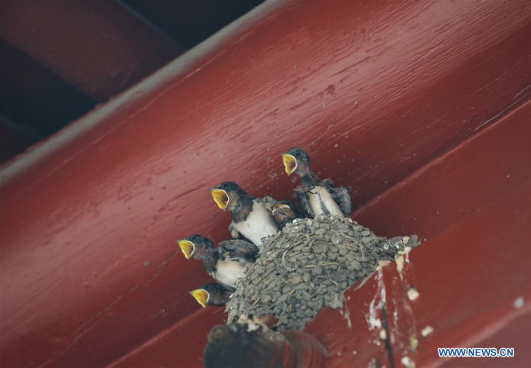 Young swallows are seen in their nest under the roof of a house in Xicheng District of Beijing, capital of China, June 29, 2017. (Xinhua/Wang Huajuan)