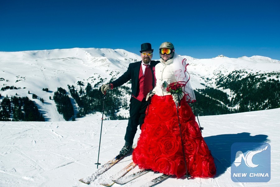 Tucker and Karyn Brown pose for a portrait while celebrating their 10th wedding anniversary during the Loveland Ski Area 26th Annual Valentine's Day Mountaintop Matrimony held near Georgetown, Colorado on February 14, 2017. (Xinhua/AFP PHOTO)