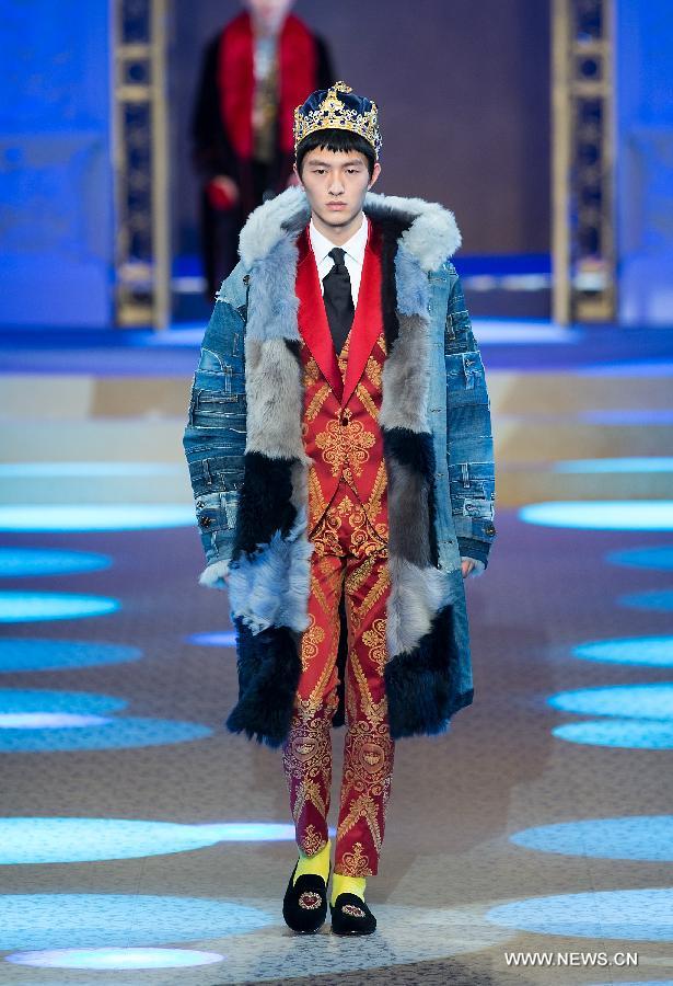 A model presents creations for fashion house Dolce&Gabbana during Milan Men's Fashion Week Fall/Winter 2018/19 in Milan, Italy, Jan. 13, 2018.(Xinhua/Jin Yu)