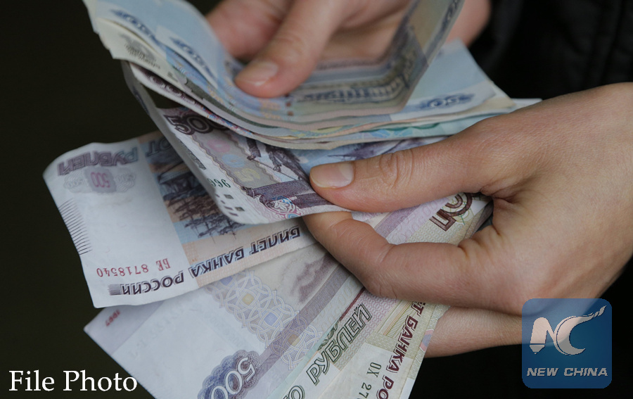 A vendor counts Russian rouble banknotes at a market in Moscow, March 3, 2014. (XINHUA/REUTERS)
