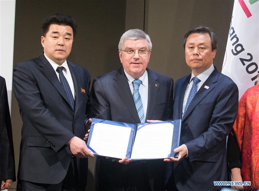 The Democratic People's Republic of Korea (DPRK)'s Olympic Committee President and Sports Minister Kim Il Guk (L), International Olympic Committee (IOC) President Thomas Bach (C), and South Korea's Sports Minister Do Jong-hwan attend a signing ceremony after a four-party meeting at the IOC headquarter in Lausanne, Switzerland, Jan. 20, 2018. (Xinhua/Xu Jinquan)