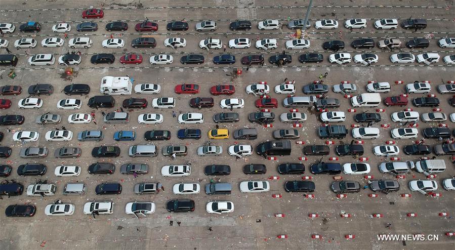 Cars wait to cross the Qiongzhou Strait at Xiuying harbour in Haikou, capital of south China's Hainan Province, Feb. 20, 2018. A heavy fog has disrupted ferry services on the Qiongzhou Strait in south China, stranding passengers in over 10,000 cars in Haikou city, capital of Hainan Province, local authorities said Tuesday. As fog started to disperse Tuesday morning, ferry services resumed in two ports in Haikou, but local government advised travelers against heading to the ports before 3 p.m., as avenues leading to them remained heavily congested. (Xinhua/Zhao Yingquan)