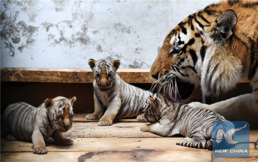A Siberian tiger licks her baby at the Siberian Tiger Park in northeast China's Heilongjiang Province, May 6, 2015. (Xinhua/Wang Jianwei)