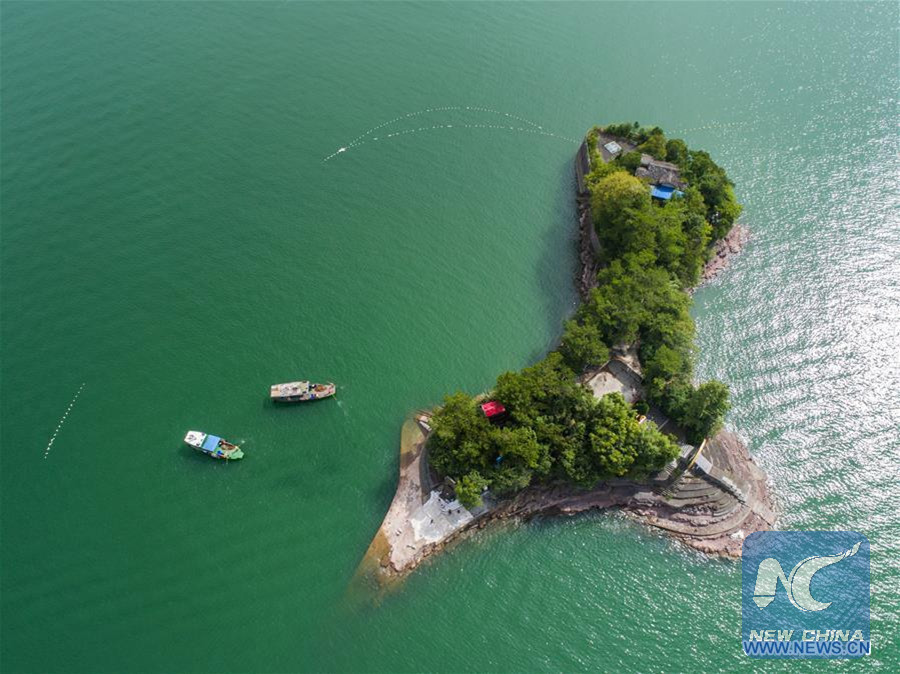 Workers clean the surface of the Qiandaohu Lake in Chun'an County of east China's Zhejiang Province Aug. 16, 2017. The lake, a famous scenic spot, is under stricter protection now as the local government issued a zero emission policy according to which garbage disposal, residents' waste water and vehicle emission are under tighter control. (Xinhua/Xu Yu)