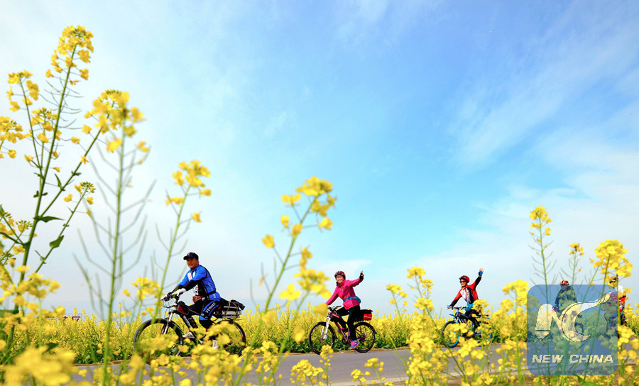 Visitors ride bicycles along the field of flowers in Ranyi Township of Chengdu, southwest China's Sichuan Province, March 11, 2018. Rural tourism has been stressed as a crucial part of China's strategies of rural vitalization. (Xinhua/Jiang Hongjing)