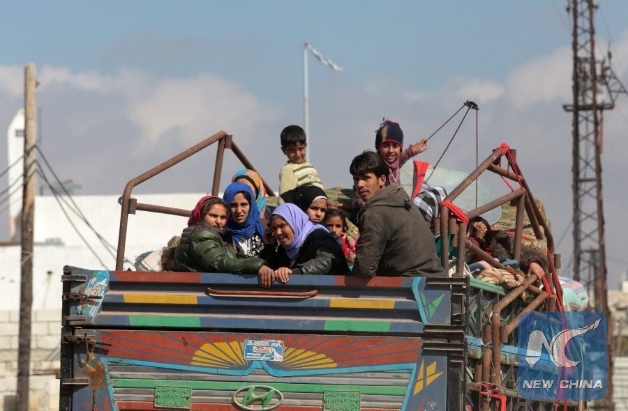 Civilians leave the city of Afrin, Syria, on March 14, 2018. Turkish President Recep Tayyip Erdogan on Wednesday expressed hope that Turkey's military and its allies would completely take Syrian Kurdish-held city of Afrin by Wednesday evening. Speaking to local administrators in Ankara, the president also said civilians in the city were being evacuated through a special corridor. (Xinhua)